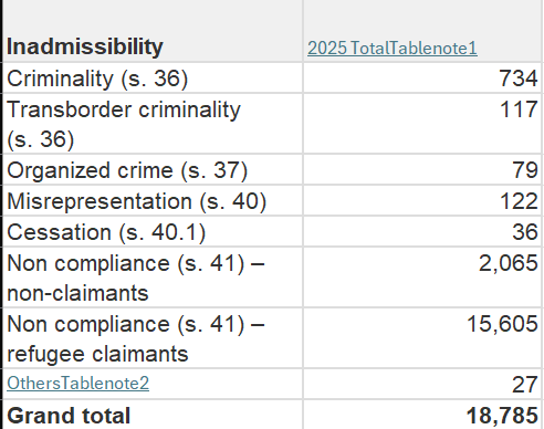 加拿大邊境服務局(CBSA)發布的2025年前十個月的遣返數據顯示,前10個月至少遣返了18,785人。