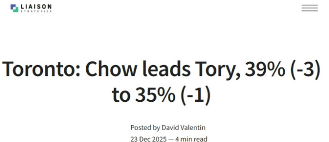 这项民调于12月19日至21日进行,采用互动语音应答(IVR)技术,对1,000 名多伦多选民进行了调查,误差范围为±3.09%,在统计上具有较高参考价值。Liaison Strategies是加拿大公认的高准确度民调机构之一,在2025年安省省选中准确率排名全国第一,在同年的联邦大选中排名全国第二,同时也是加拿大研究洞察委员会(CRIC)的成员。