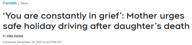 加拿大曼尼托巴省温尼伯市,一位在2022年因酒驾事故失去女儿的母亲,呼吁大家在这个假期如果打算喝酒,一定要提前安排好安全回家的方式。