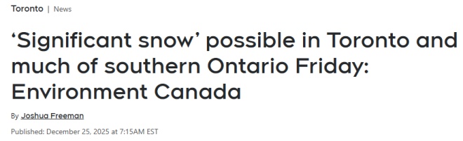 环境部已经针对安省南部发布了黄色和灰色天气预警。从周五下午到晚上,大多伦多地区将有最多10厘米的降雪。不过,环境部也表示,低压系统的具体路径仍存在一定不确定性。