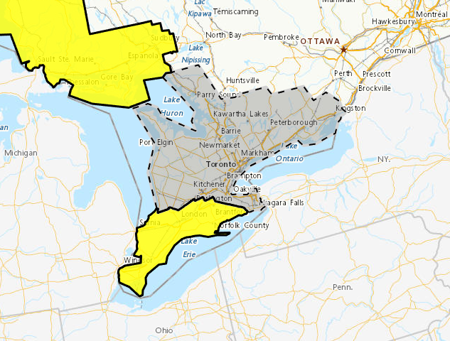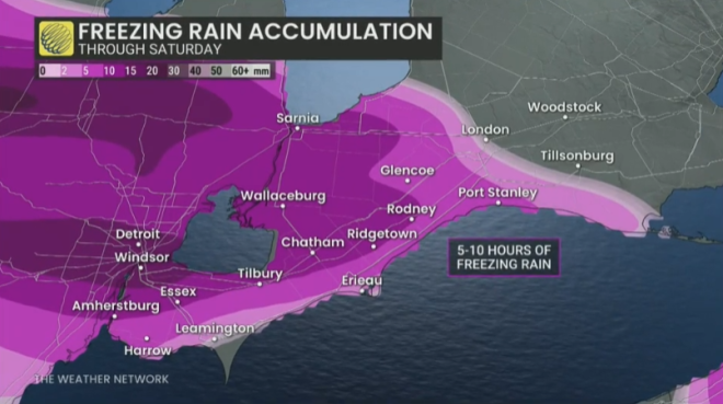 天气预报显示,温莎(Windsor)和查塔姆(Chatham)附近的西南安省地区,可能会出现长达5至10小时的持续冻雨。