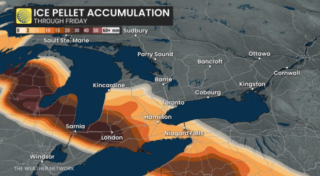 预计周五白天,萨尼亚(Sarnia)和伦敦(London)一带的西南安省地区将出现一条冰粒积聚带。居民应在确保安全的前提下尽快清理冰粒,因为它们很容易迅速冻结成一整层坚硬的冰。