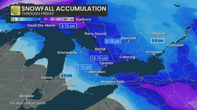 周五晚间,在尼亚加拉(Niagara)、多伦多、奥沙瓦(Oshawa)和巴里(Barrie)一带,降雪中可能会夹杂冰粒,这将限制总降雪量。该系统预计在周六早晨逐渐移出。