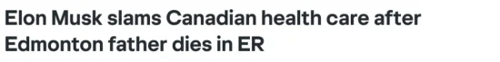 亞省愛民頓一位44歲的三孩父親在醫院急症室等待8小時之後過世,科技大亨馬斯克猛烈抨擊了加拿大的醫療保健系統,指與車管局一樣差。