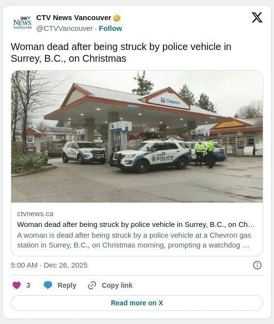 一名女子在圣诞节清晨于BC省素里市的一家雪佛龙(Chevron)加油站内被一辆警车撞击后身亡,事件已引发独立监督机构的调查。