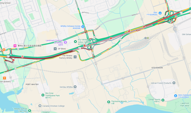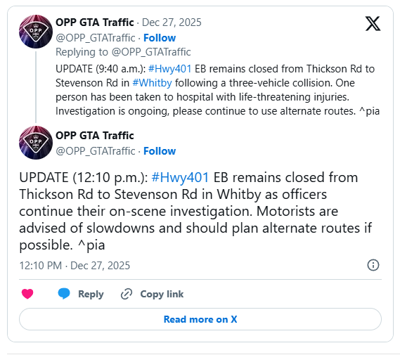 根据安省省警GTA地区X账号在上午约7:40发布的更新,警方表示,Highway401东行方向在Thickson Road与Stevenson Road之间已被完全封闭。