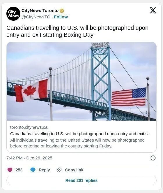 这些规定已经于12月26日生效,适用于所有非美国公民,包括加拿大旅客和外交人员。