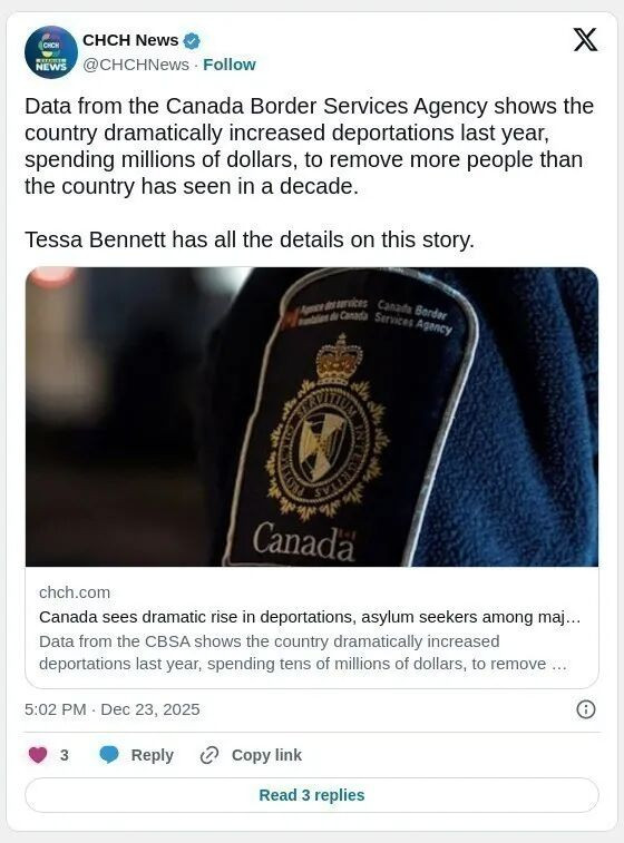 根据 CBSA 公布的联邦数据,在2024—2025财年,加拿大共遣返了超过1.8万人。其中大多数为寻求庇护者,遣返过程共花费约7,800万加元,这些人的难民申请多已被拒绝。