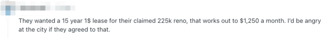 有网友直接算账指出,两人提出的15年、年租$1元的租约,若以其自称的$22.5万元翻修成本计算,折合每月约$1250元。“如果市政府真的同意了这种条件,我才会对市政府感到愤怒。”