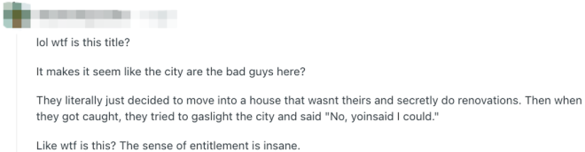 也有网友将矛头指向报道叙事本身,质疑标题是否刻意把市政府塑造成“反派”。评论直言:“这标题在干什么?看起来好像是市政府做错了事。他们只是决定搬进一栋不属于自己的房子,偷偷进行翻修,被发现后又反过来说‘你们同意过’。”