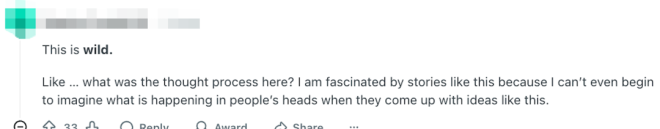 也有高赞评论用一句话概括整体感受:“这事太野了。完全无法想象,人们是如何想出这种方案的”。