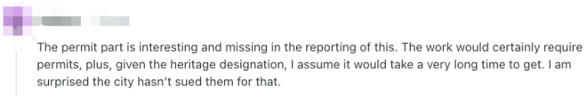 评论认为,在历史保护建筑内进行如此规模的翻修,必然需要复杂且耗时的审批流程,“考虑到这是历史建筑,审批时间只会更长”,并直言“反而让我惊讶的是,市政府居然没有因此起诉他们”。