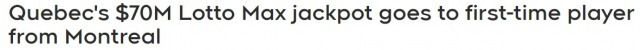 2020年10月9日,来自蒙特利尔华人女子李淑萍(Shu Ping Li;音译)在领奖时坦言,真是非常走运,第一次买彩票就中了如此大奖。