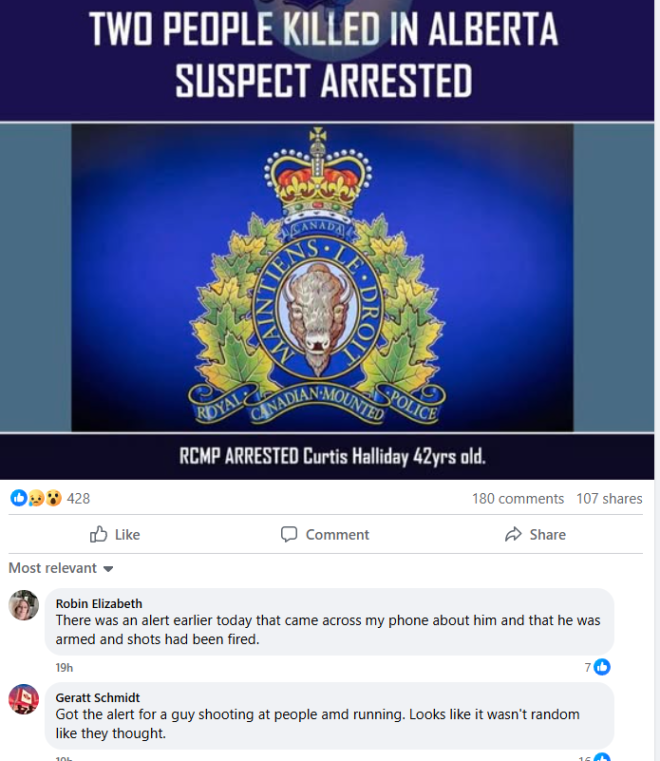 阿尔伯塔省加拿大皇家骑警已逮捕42岁的Curtis Halliday,此前警方曾针对阿尔伯塔省西北部发布“危险人物警报”,警告公众高度警惕一名持枪且极度危险的男子。