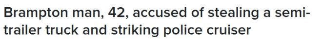 大多伦多近日发生一起惊险的失窃车辆追捕事件。一辆被盗半挂卡车在警方拦截时拒不停驶,并撞上警车,现场画面随后由警方公布。