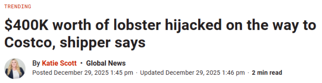 近日,一家负责海鲜运输的物流公司表示,一批价值约40万美元的龙虾,在运往Costco仓库的途中被人盗走。