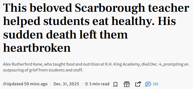 年仅43岁的Alex Rutherford Kane,是士嘉堡R.H. King Academy高中的一名老师。今年12月4日,他因突发且严重的红斑狼疮并发症去世。