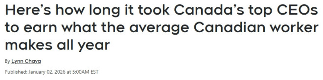 这一时间节点来自加拿大政策替代中心(Canadian Centre for Policy Alternatives,CCPA)收集的数据。该机构长期追踪加拿大最高薪酬企业高管的收入情况。