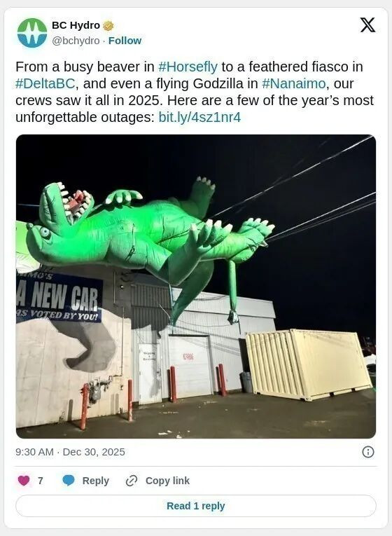 BC省水电局(BC Hydro)在年终之时盘点了2025年他们遇到的最令人难忘的一些停电事件,看了这些事件只能说,什么都有可能发生。