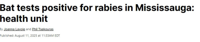 皮尔区公共卫生局发布通报称,在密西沙加Derry和McLaughlin一带发现一只狂犬病检测呈阳性的蝙蝠。