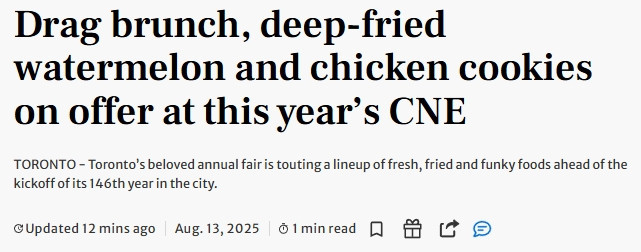 今年的“奇葩”美食包括:油炸西瓜、黄油冰淇淋、夹满鸡块的曲奇饼,以及以热门卡通角色“Labubu”为主题的芝士凝乳。