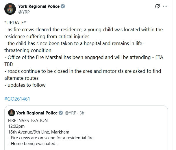 紧急救援人员于中午12点刚过接报,赶赴位于16th Avenue与9th Line附近,Spragg Circle的一处住宅。