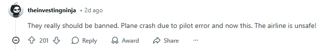 “我一直很惊讶印度航空和巴基斯坦国际航空竟然还没有被禁飞。它们的飞行安全记录令人质疑,几乎所有人都拒绝乘坐它们的航班,包括它们本国的公民,而且它们还屡次违反相关规定。它们怎么还没有被禁飞呢?”