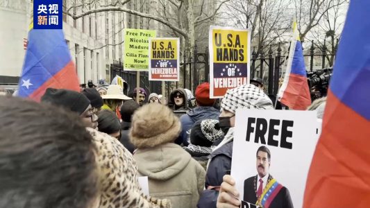 总台记者在现场看到,法院周边安保明显加强,多辆警车停靠在路口布防。民众在法院外广场及周边街道聚集,他们举着“释放马杜罗”“不要向委内瑞拉开战”等标语横幅,不时高呼口号,对美方行动表示不满。