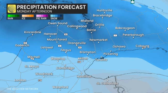 预计周二上午晚些时候,从安省西南部开始,将出现雨雪混合天气。随着暖锋推进,GTA西北部内陆地区更容易出现冻雨。
