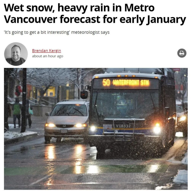 目前降雪量仍存在较大不确定性,但北温哥华山坡、Burnaby Mountain 以及高贵林部分地区,可能会出现几厘米的湿雪。该系统预计在夜间减弱,随后短暂放晴。