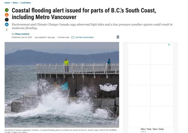 加拿大环境与气候变化部(Environment and Climate Change Canada)已向卑诗省南海岸发布沿海洪水特别警报,其中包括大温地区的多个沿海区域。气象部门警告称,本周末至下周初,受多重因素叠加影响,部分沿海地区存在发生轻至中度沿海洪水的风险,风险高峰预计出现在周日