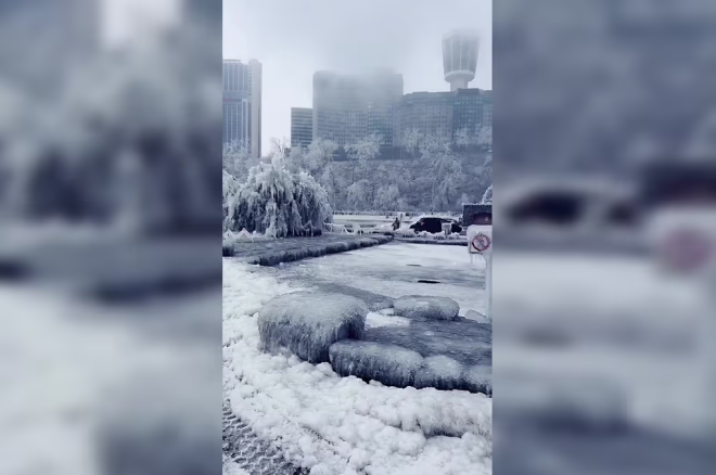 攝影師Christopher Mathew拍攝的一段視頻被尼亞加拉公園管理局(Niagara Parks) 轉發,畫面顯示,在俯瞰馬蹄瀑布(Horseshoe Falls) 的熱門觀景區域,幾乎所有東西都被冰層嚴嚴實實地包住,景象十分震撼。