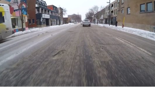【時報專訊】在滿市Papineau和Mont-Royal交匯處附近,路面坑洼不平車輛行駛緩慢,因為一大片坑洼迫使司機們不得不急轉彎以避免車輛受損。