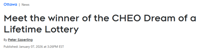 Aimee Savard在新年伊始就迎来了人生大礼——她赢得了CHEO“一生一次的梦想”(CHEO Dream of a Lifetime Lottery)的头奖:位于安省渥太华地区Manotick的一套Minto梦想。