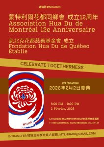 為慶祝滿地可花都同鄉會成立12周年,暨“魁北克花都慈善基金會”成立,本會定於2026年2月2日(星期一)晚17:30時,在南岸金豐酒家舉行盛大慶典。屆時,我們將回顧過往碩果,展望未來願景,並以基金會成立為契機,進一步凝聚力量,推動公益,回饋社會。