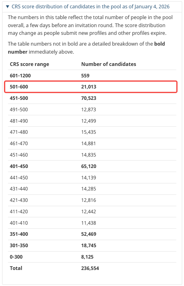 截止1月4日,EE候选池内还有21,013名501-600分的候选人。