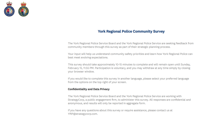 警察局在官网上写道,“整个区域的人在安全、警务和社区优先事项上有不同的经历和观点,你的意见将帮助我们了解最重要的问题,以及约克区警察如何在满足不断变化的期望的同时,维持公共安全。”