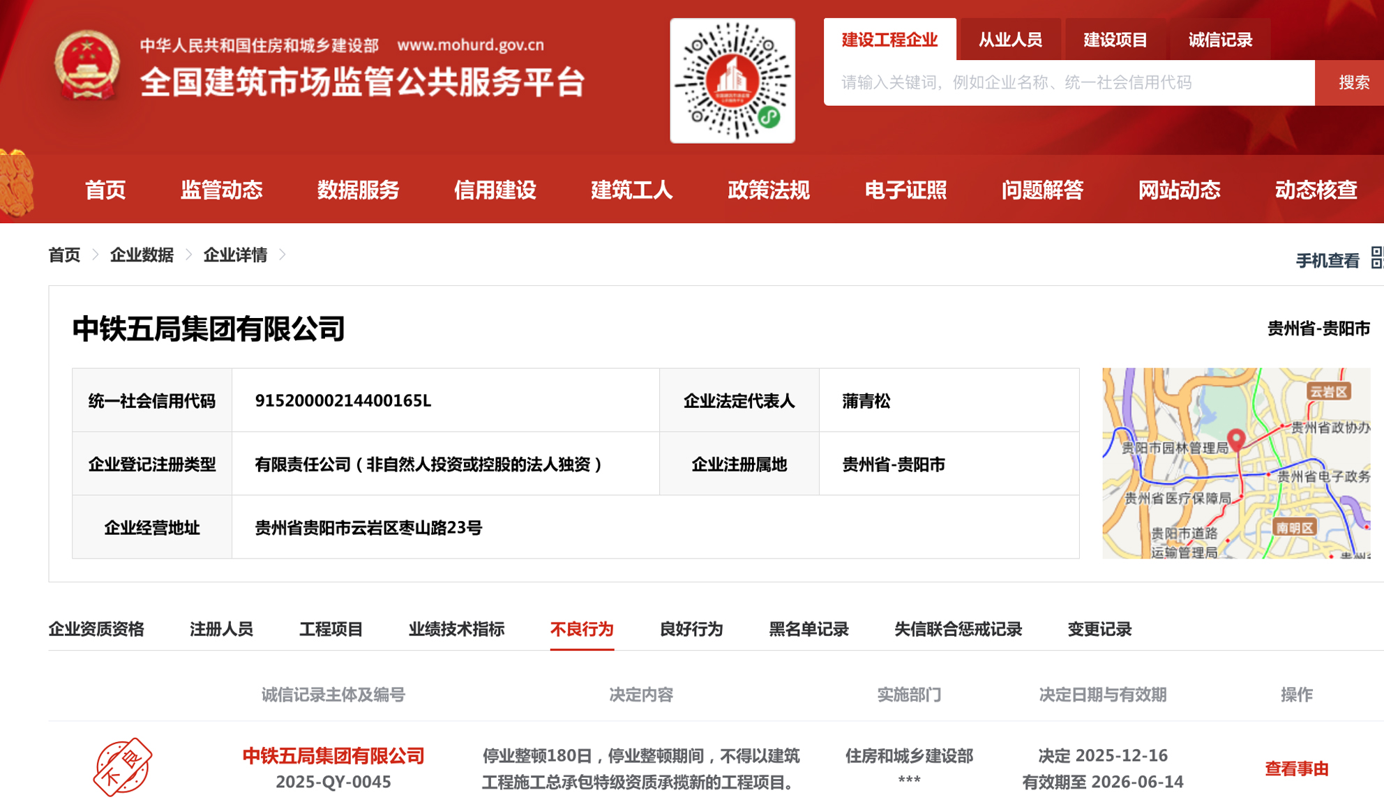中新网1月9日电 全国建筑市场监管公共服务平台显示,中铁五局集团有限公司(简称“中铁五局”)被住房和城乡建设部实施停业整顿180日,决定时间为2025年12月16日,有效期至2026年6月14日。停业整顿期间,不得以建筑工程施工总承包特级资质承揽新的工程项目,涉及的具体事由未公开。