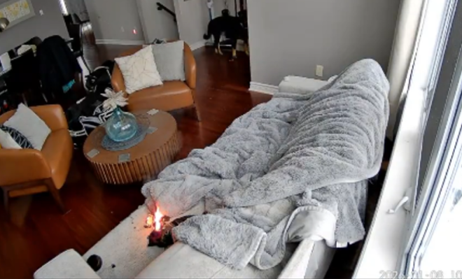 屋主分享的室内监控画面显示,一只狗坐在沙发上啃咬一只黑色滑雪手套,而这只手套内含由锂离子电池供电的加热组件。突然之间,狗站了起来,电池开始冒烟。随后狗退开,只见烟雾弥漫,电池随即起火燃烧。