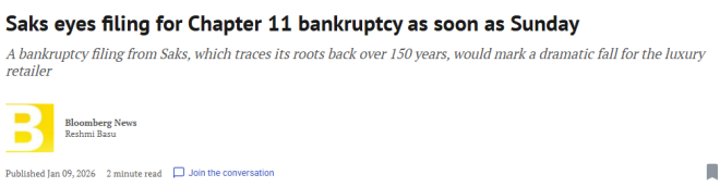 就在去年12月30日,Saks未能按时支付超过1亿美元的利息,正式触发破产风险。知情人士表示,由于公司资金缺口实在太大,破产几乎已经不可避免。