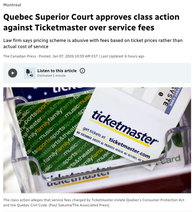 蒙特利尔律师事务所 Paquette Gadler 提起的集体诉讼称,Ticketmaster 收取的服务费违反了魁北克省消费者保护法和魁北克省民法典。