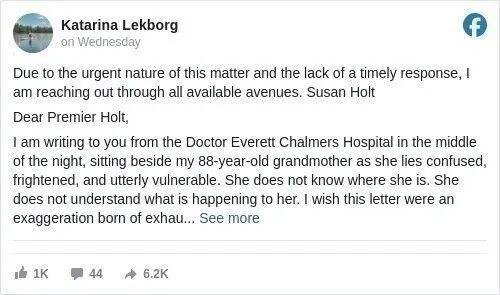 她在写给省长苏珊·霍尔特(Susan Holt)的信中表示,她88岁的祖母本周得了严重的病,并用担架抬到一个叫“MTU”的区域,即过渡单元。