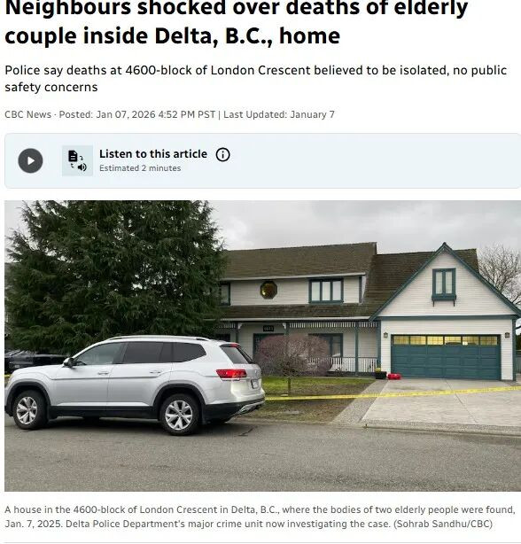 大温三角洲市一对老年夫妇在家中猝死,邻居震惊不已。警方称,伦敦新月街4600号街区发生的这起死亡被认为是孤立事件,不涉及公共安全问题。