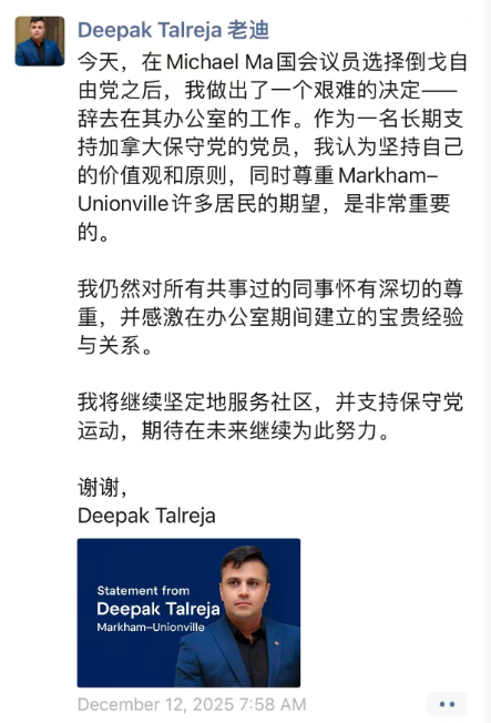 鉴于Michael Ma自2025年12月11号公开跳党以来,几次三番对媒体及公众强调他是“仔细聆听了选民意见才选择跳党”,并且他在12月10号参加保守党圣诞晚宴时“仍然是一个真正的保守党议员”。