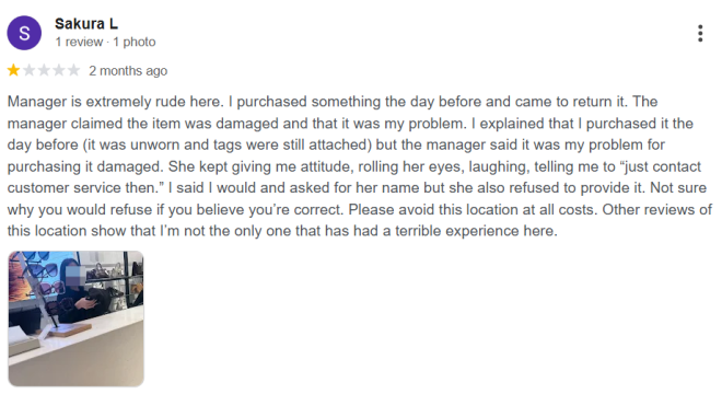 “这里的经理极其粗鲁。我前一天刚买的商品,第二天过来退货。经理说商品已经损坏,并说是我弄坏的。我向她解释,这件商品是前一天刚买的,从未穿过,而且吊牌仍然完好,但经理却坚持说,是我在购买后把商品弄坏的。在整个过程中,她一直对我态度恶劣,翻白眼、嘲笑我,还让我‘直接去联系客服吧’。我要求她提供姓名,但她拒绝告知。强烈建议大家避开这家门店。从其他评价也能看出,我并不是唯一一个在这里有过糟糕经历的人。”