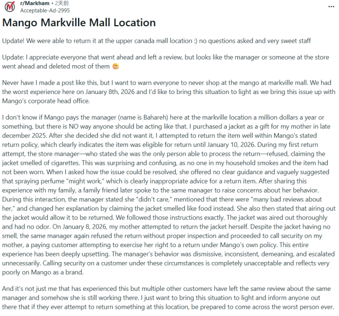 帖子写道:“我想要想提醒大家:千万不要去Markville Mall的Mango店。2026年1月8日我们在这家店经历了一次极其糟糕的购物体验,我想把这件事曝光,同时也会向Mango总部投诉。”
