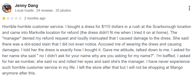 “糟糕到不能再糟的客户服务。我当时在士嘉堡Mango门店匆忙买了一条110加元的连衣裙,回家试穿后发现尺码不合适,于是前往Markville门店退款。但这位经理当场拒绝了我的退款请求,并且大声暗示是我把裙子弄坏了。她说裙子上有一个针尖大小的污点,而我之前甚至都没注意到。她指责我穿过这条裙子并造成了损坏。我告诉她,裙子的状态和我买回来时一模一样。但她的态度非常差,我要求她告诉我名字,她却说:‘不,我没问你的名字,你为什么要问我的名字?’我完全傻眼了。我又要求她提供员工编号,她直接拒绝,还翻了个白眼,并强调:‘我是经理。’我这辈子从没经历过这么糟糕的客户服务。我随后离开了这家店,以后也绝不会再在Mango购物了。”