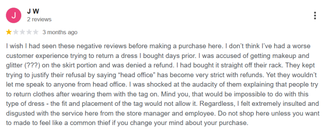 “真希望我在来这里购物之前就看过这些差评。我从没遇到过比这次更糟糕的退货体验。我尝试退回一条几天前刚买的连衣裙,却被指控说我把化妆品和亮粉(???)弄到了裙子的下摆上,因此拒绝给我退款。他们不断为拒绝退款找理由,说‘总部现在对退货要求非常严格’,但同时又不允许我与总部的任何人沟通。让我震惊的是,他们还振振有词地解释说:‘很多人会在穿过衣服后,还带着吊牌来退货。’可问题是,这条裙子的版型和吊牌位置,根本不可能在穿过的情况下还保留吊牌。无论如何,这家店的经理和员工的服务态度让我感到极度被羞辱和恶心。如果你不想在改变主意想退货时,被当成一个小偷一样对待,千万不要来这家店购物。”