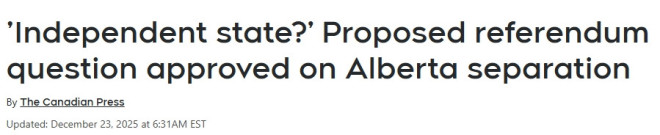 据报道,阿省选举机构周一宣布,已批准一项关于该省是否脱离加拿大的公投提问。