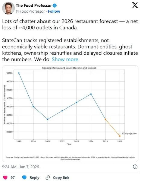 达尔豪斯大学(Dalhousie University)最新一项研究显示,去年全加拿大有约7,000家餐厅倒闭,而到2026年,还将有大约4,000家餐厅撑不下去。